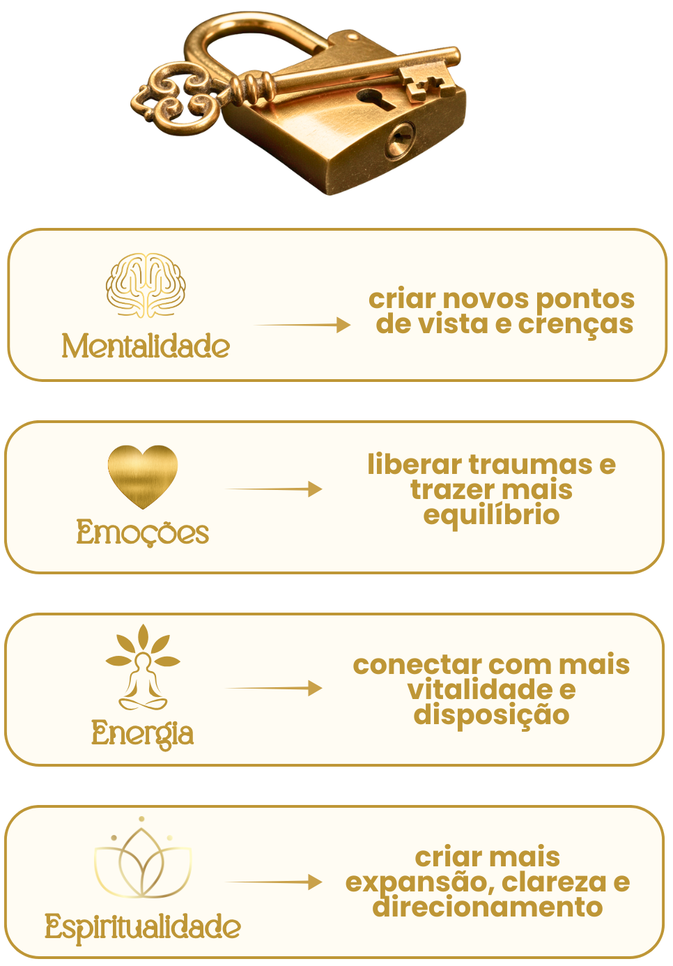 Você escolhe por onde e quando quer começar, e eu te dou o passo a passo com ferramentas de reprogramação mental, expansão e energia.