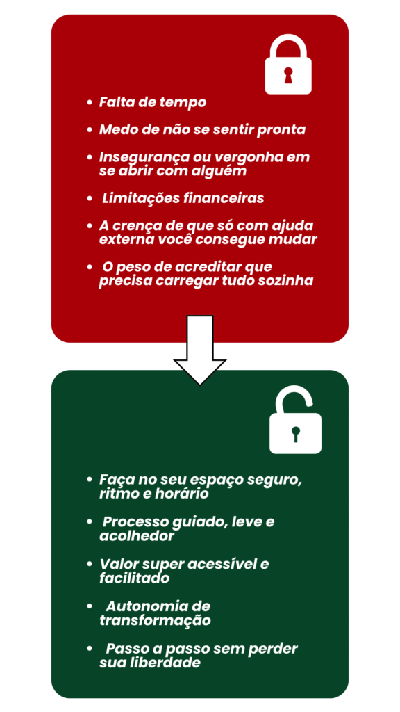 São 5 Sessões Terapêuticas Guiadas, em formato digital, criadas para MULHERES que se sentem TRAVADAS em sua jornada profissional e que desejam compreender e liberar os bloqueios "ocultos" que as impedem de prosperar.